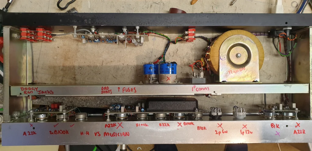 This one came to me with just has a few clicky pots and switches and is in very good condition. Upon inspection found that one of the PSU smoothing capacitors, the negative supply, had ruptured. You can see a picture below of the cap. At over thirty years old, that’s not bad wear and tear.  Sounds clear as a bell now – boy are these things are well made.