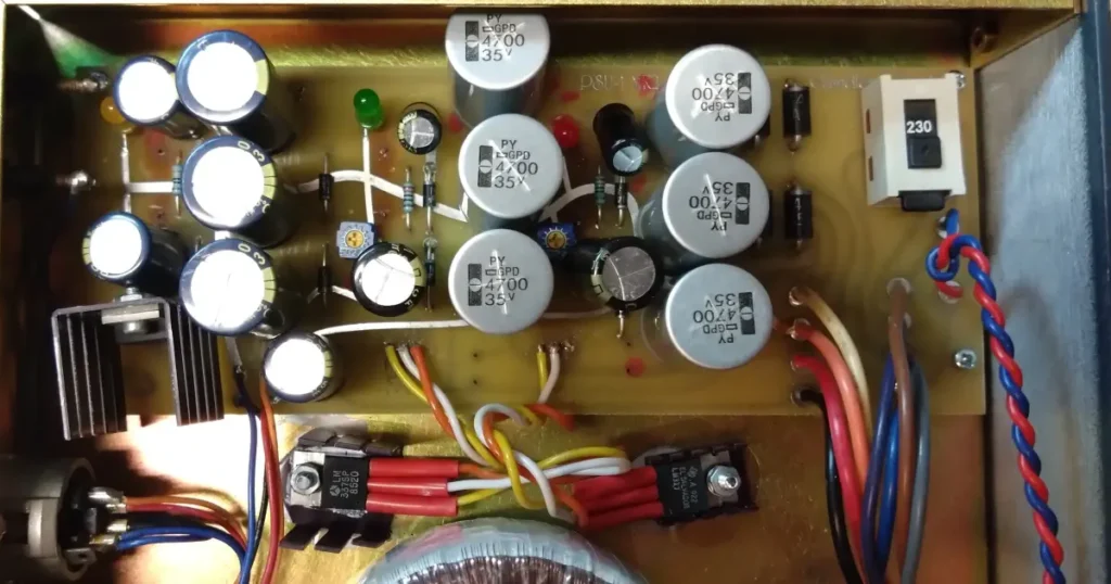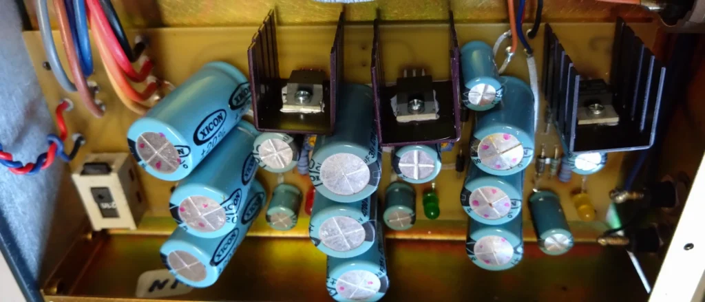 If you open up the PSU you may well see the damaged capacitors like in the pictures below. Typically, worn capacitors will bulge up at the top and may leak oil. The ones in the picture below marked with pink dots are all clearly worn out.